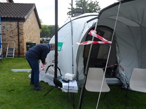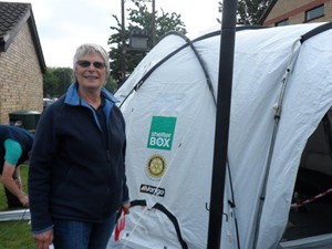 Rotarians David and Mary Whitehead of the Rotary Club of Biggleswade Ivel setting up the Shelter Box tent and display.