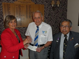 Past President Rotarian John Asher of Rotary Club of Grantham Kesteven receiving a cheque of £425.00 the joint president Margaret as our donation for a 'Carpenter Trade Box' to be sent to a school in Malawi (East Africa) for their Vocational Training Project.