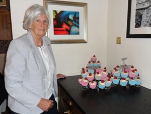 Rtn Judy Gell with all the cup cakes she made for the members and their guests attending.