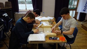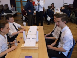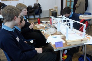The aim of the Tournament is to give the students experience of undertaking a project to build a specified machine within a tight timescale. They are given the details of the task at the beginning of the day and are expected to analyse the requirement, draw up a suitable design and construct the machine within 4 hours. After lunch, each team has to demonstrate the machine that they have built to the judges. The teams are assessed throughout the day on the way in which they tackle the project and the performance of the machine when tested. This year’s task was to design and build a pair of bridges which had to be capable of supporting a weight of 1kgm. The longer bridge was fixed but the shorter one required a mechanism to allow it to be lifted so that a model ship could pass through. The bridges had to be constructed from a kit of parts, supplied by the Rotary Club, in which the main building material was thin card which could be joined with the glue provided.